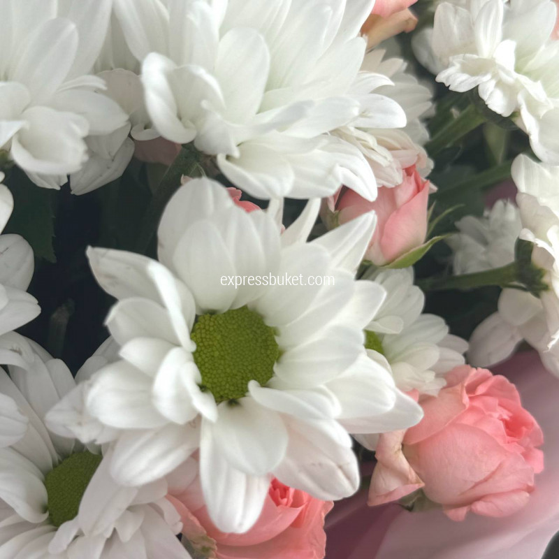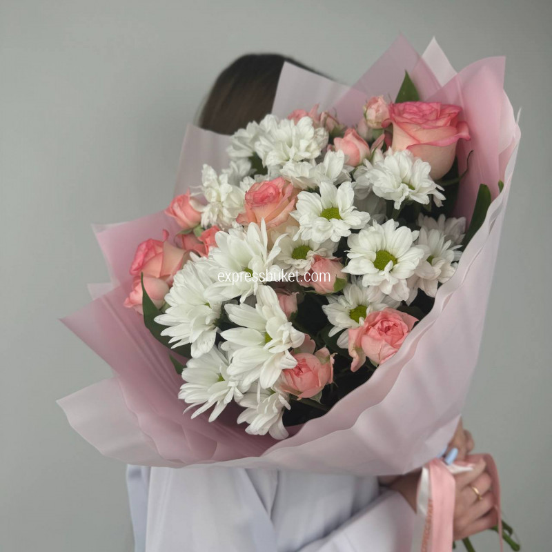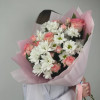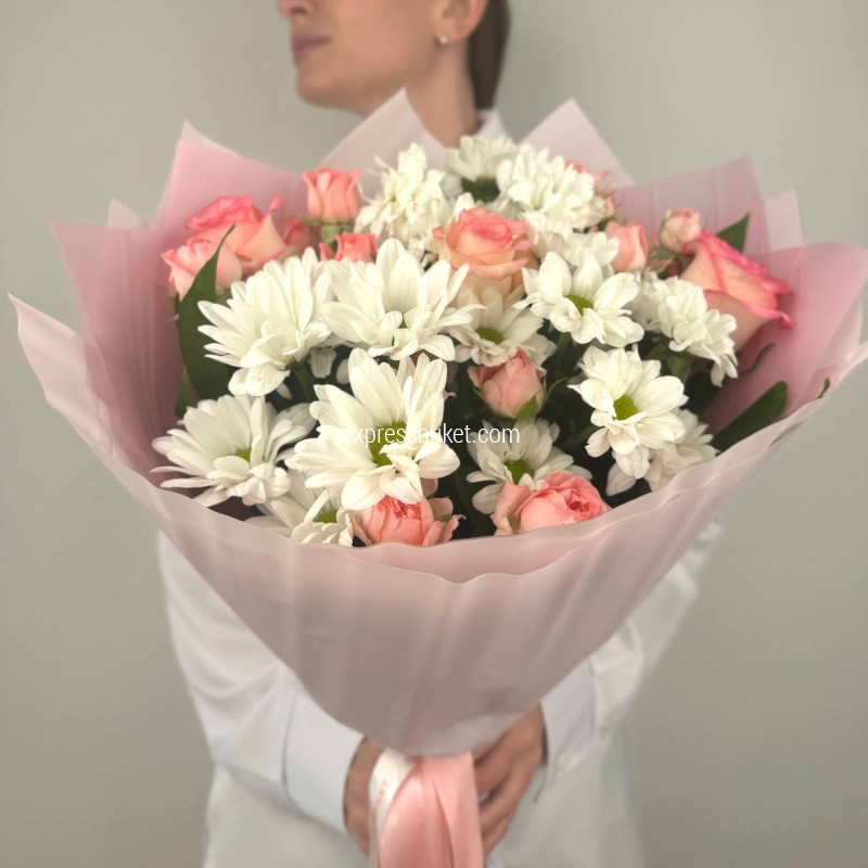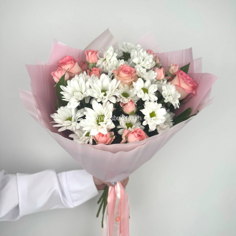 Современная упаковка - 1;Лента атласная - 1;Роза Джумилия (50см) РОССИЯ - 3;Хризантема кустовая белая - 3;Роза кустовая - 3;