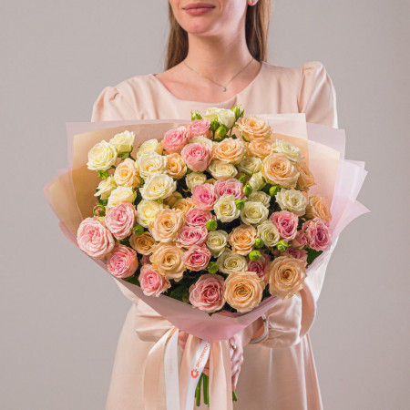 Эустома - 3;Роза кустовая - 5;Роза Аваланж (50см) РОССИЯ - 5;Пион - 4;Львиный зев - 2;Озотамнус - 4;Хамелациум - 4;Русскус отеч. - 10;Лента атласная - 1;Современная упаковка - 1;